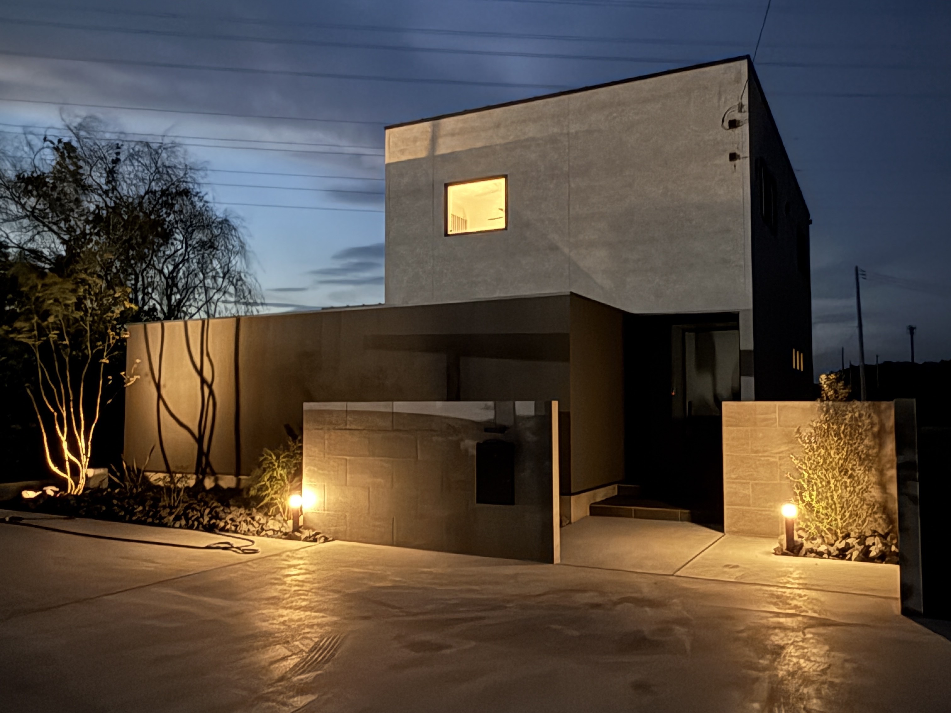 外壁はKMEW 「FLAT DESIGN PANEL」。モルタル柄に細かなドットが浮かび上がります。