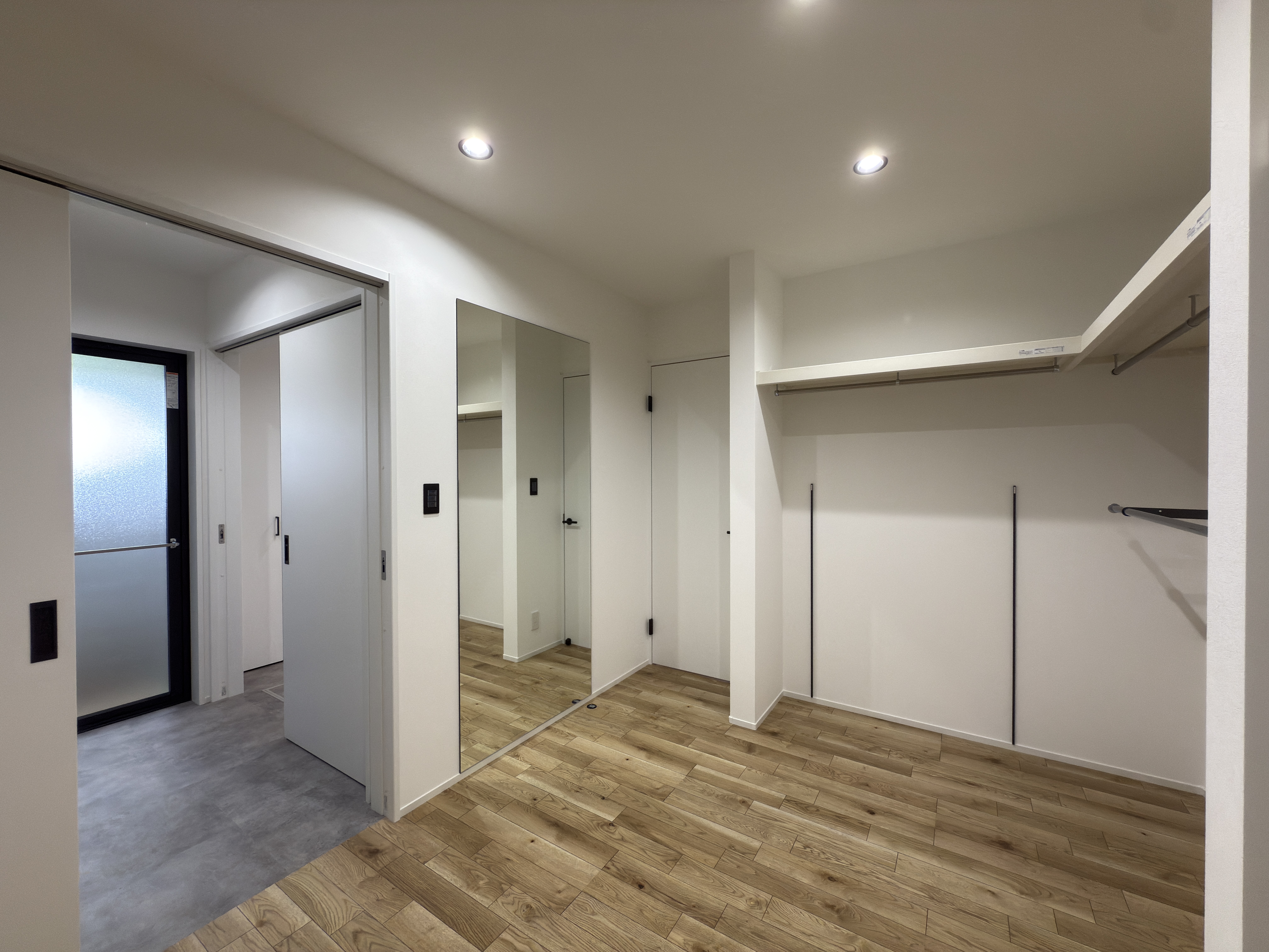 リビングからアクセスできる6帖のWIC。生活スタイルの変化に対応できるようハンガーパイプと棚柱を設置。