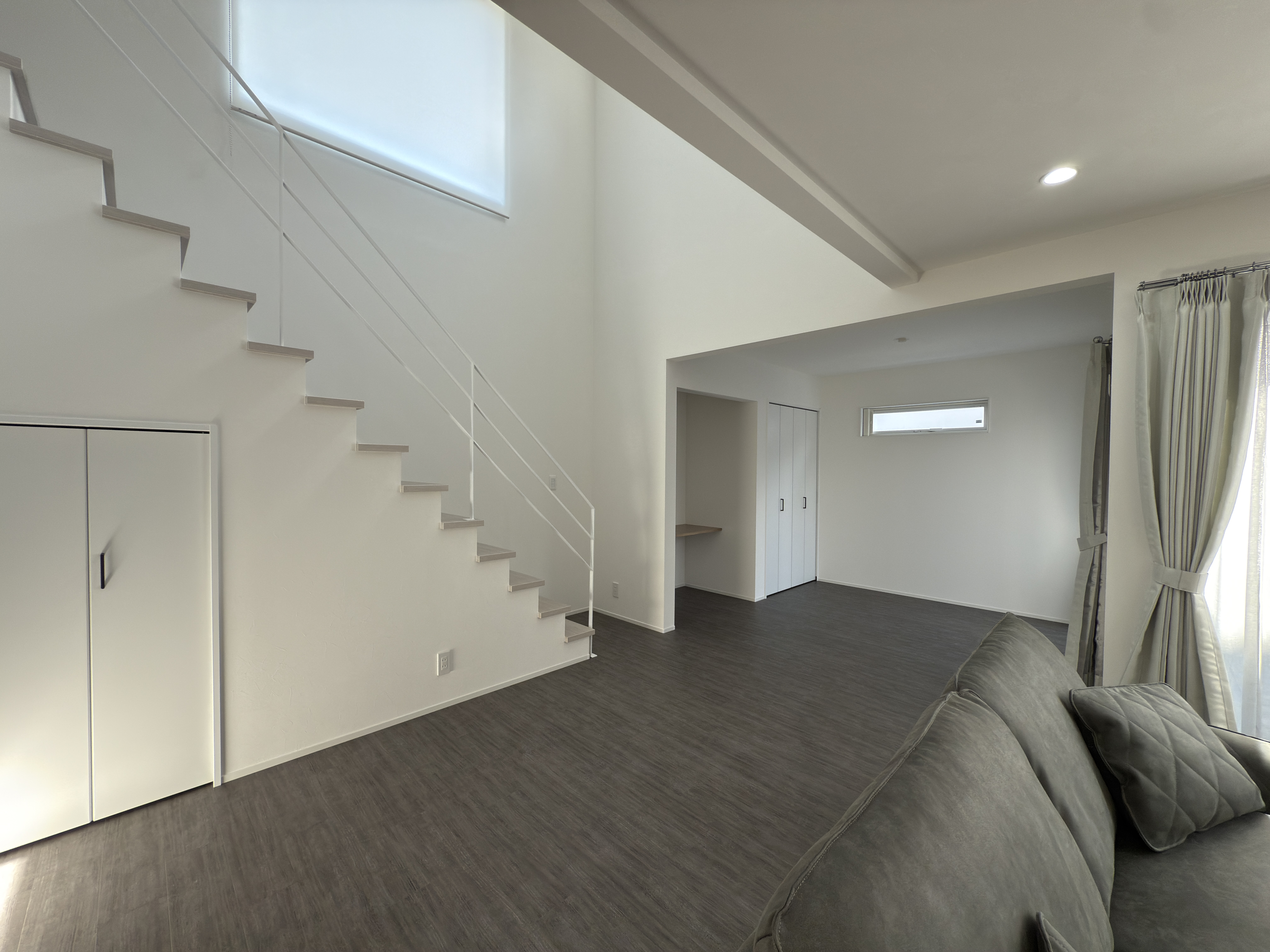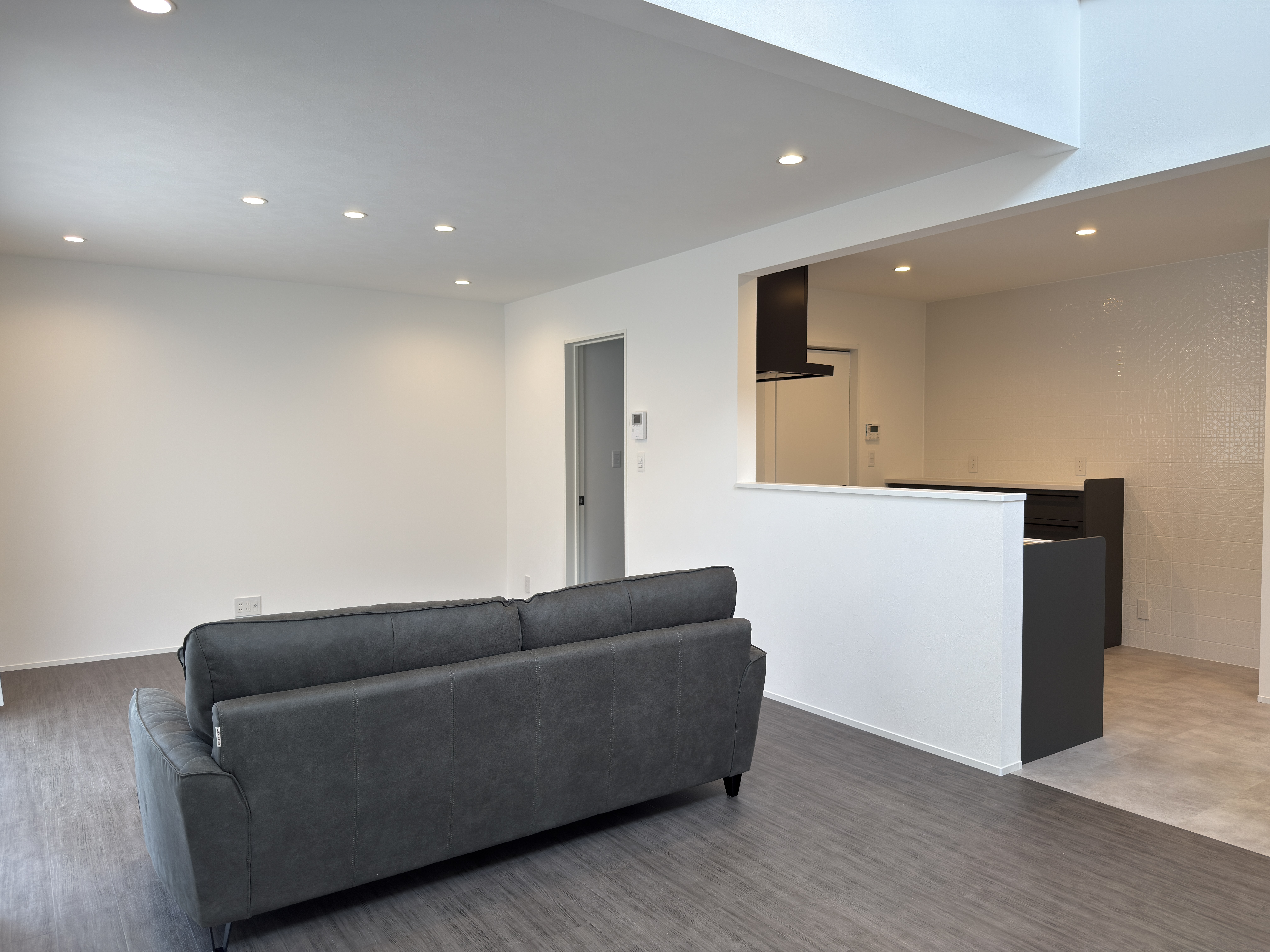 白を基調にグレーを差し色として取り入れた、落ち着きのあるリビング。余計な装飾を排したミニマルなデザインが、空間の広がりと清潔感を引き立てます。