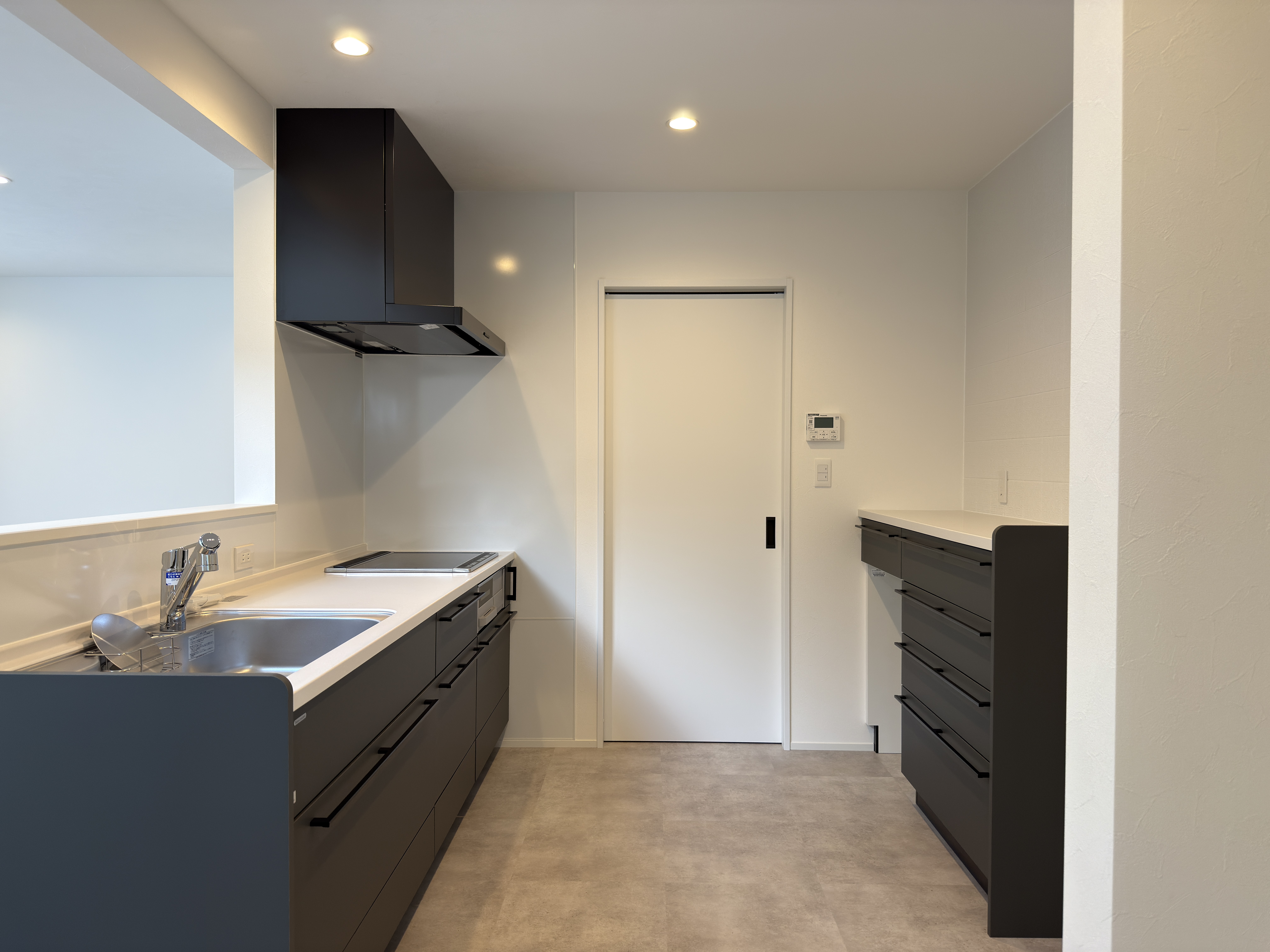 床はすべてフロアタイル仕上げ。リビングはグレーの木目でナチュラルな優しさを、キッチン・洗面・トイレはモルタル調でシャープさをプラス。