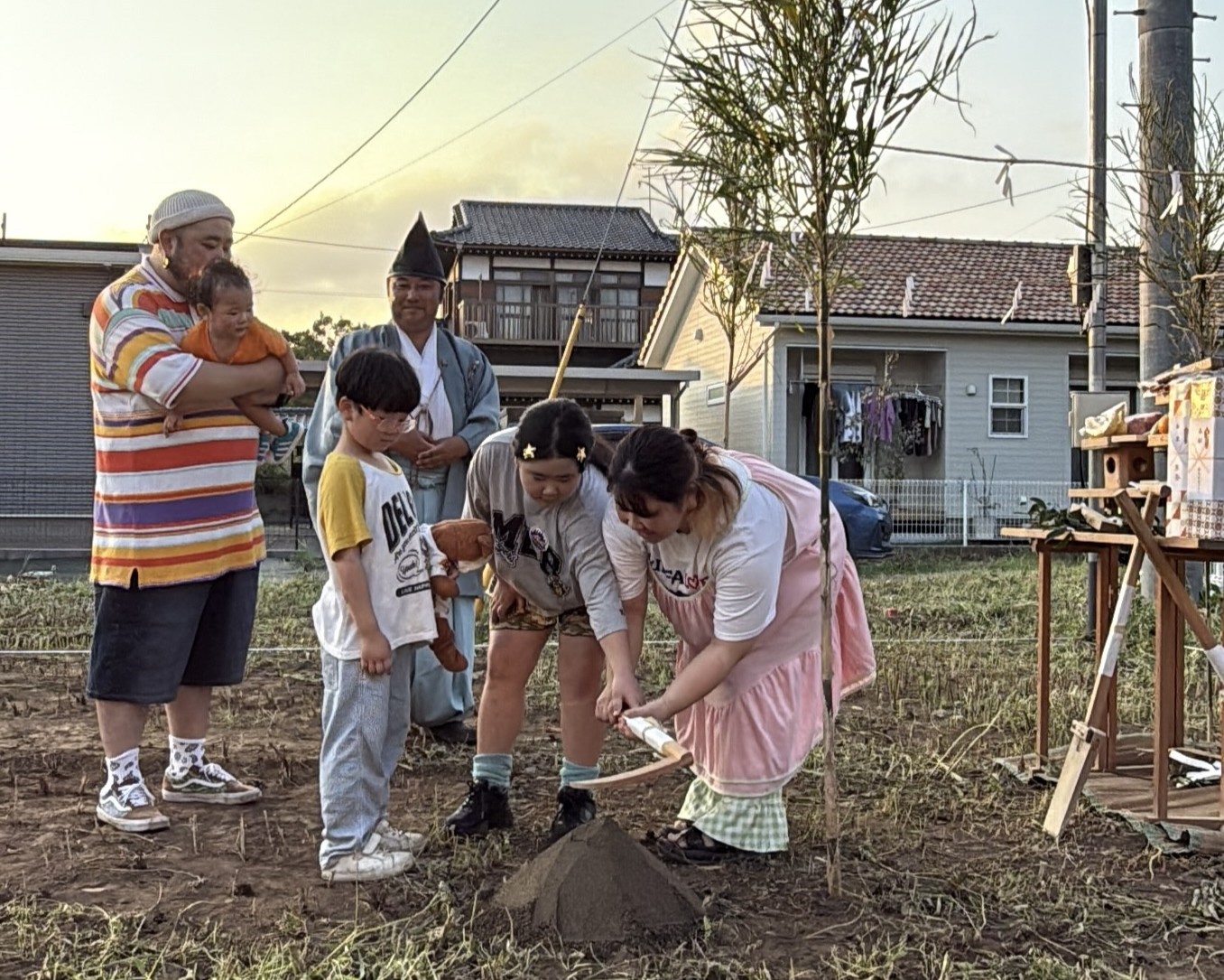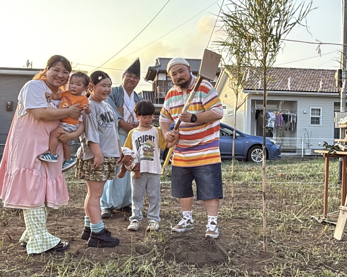 神主さんの所作に興味津々な様子や、楽しそうにはしゃぐ姿が、その場をいっそう明るくしてくれました。暑さにも負けないご家族のエネルギーとやさしい雰囲気に包まれて、とても和やかで心あたたまる地鎮祭となりました。