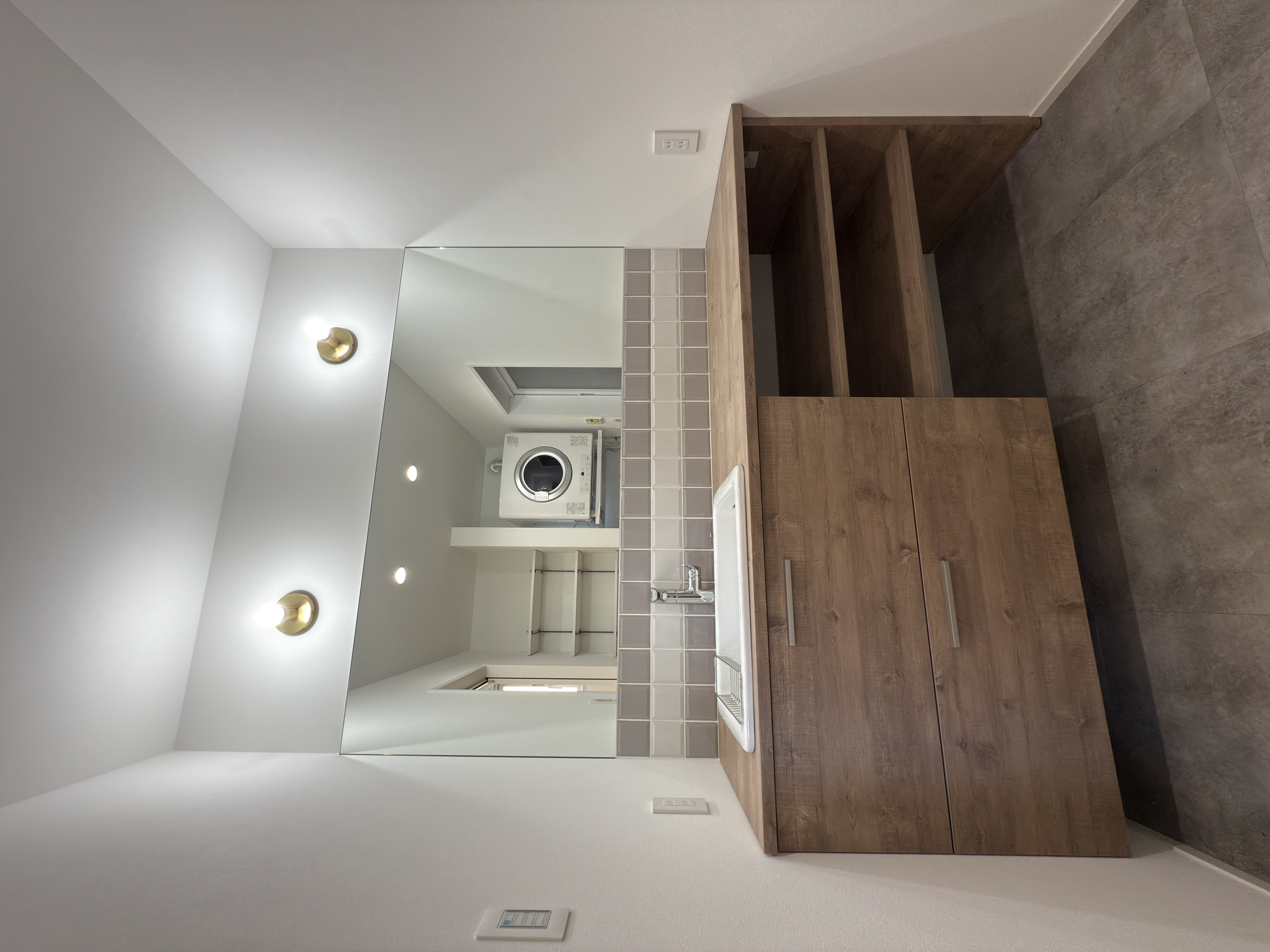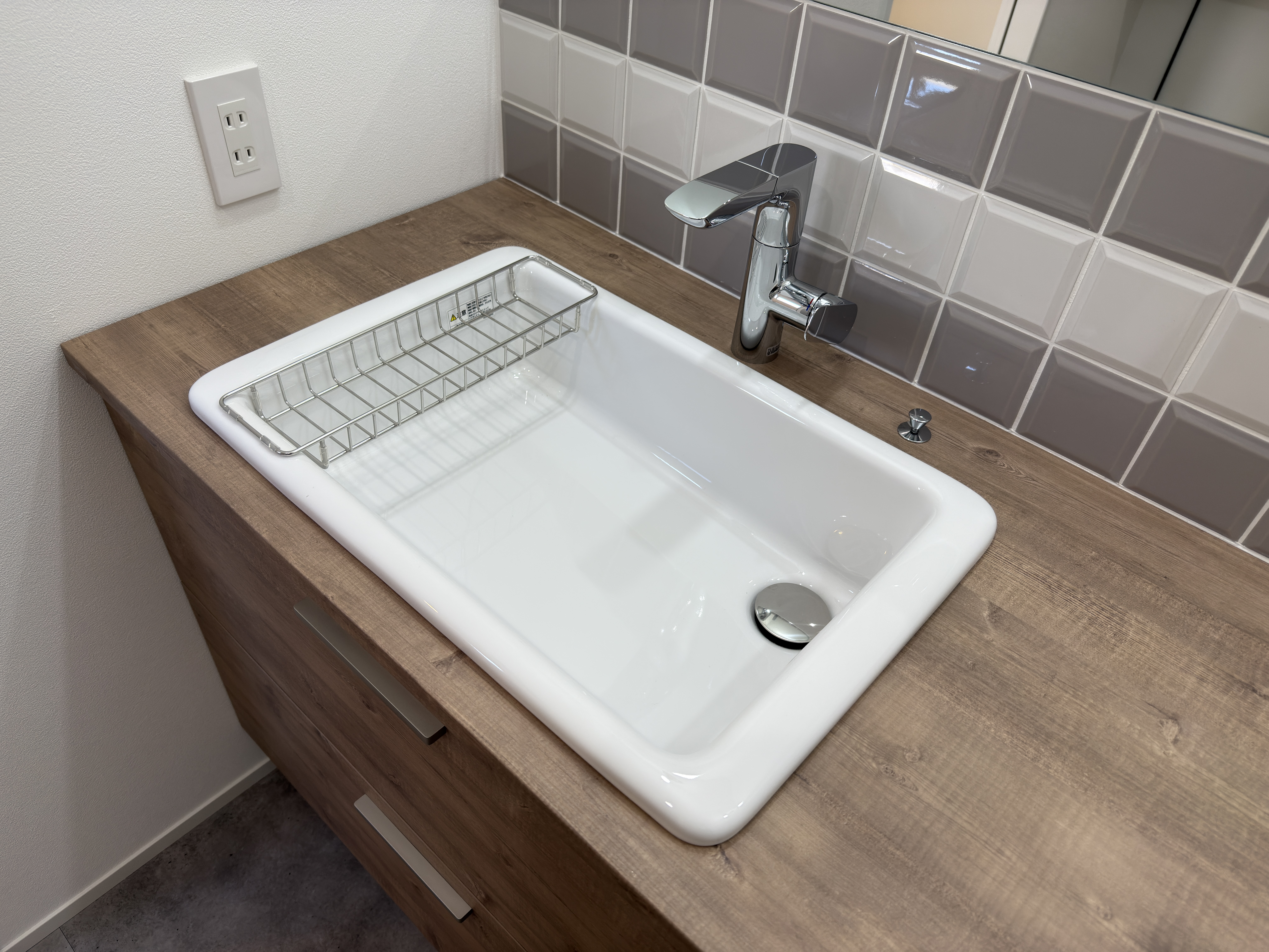毎日何度も使う洗面スペースだからこそ、使いやすさとデザインのどちらにもこだわりました。セレクトしたのは、造作家具のような木質感が魅力の TOTO ドレーナ。既製品でありながら、まるでオーダーメイドのような佇まいで、空間にやさしくなじみます。深さのあるシンクは、水はねしにくく、毎日の洗顔や手洗いはもちろん、つけ置き洗いや掃除もしやすい使い勝手の良さが魅力。カウンター横にはオープン棚を設け、タオルや小物をすっきり収納できます。やわらかな色合いのタイルと、壁一面に広がる大きなミラーを組み合わせることで、洗面室全体に明るさと広がりをプラス。シンプルでありながら、毎日使うたびに少し気分が上がる、そんな洗面スペースに仕上がりました。