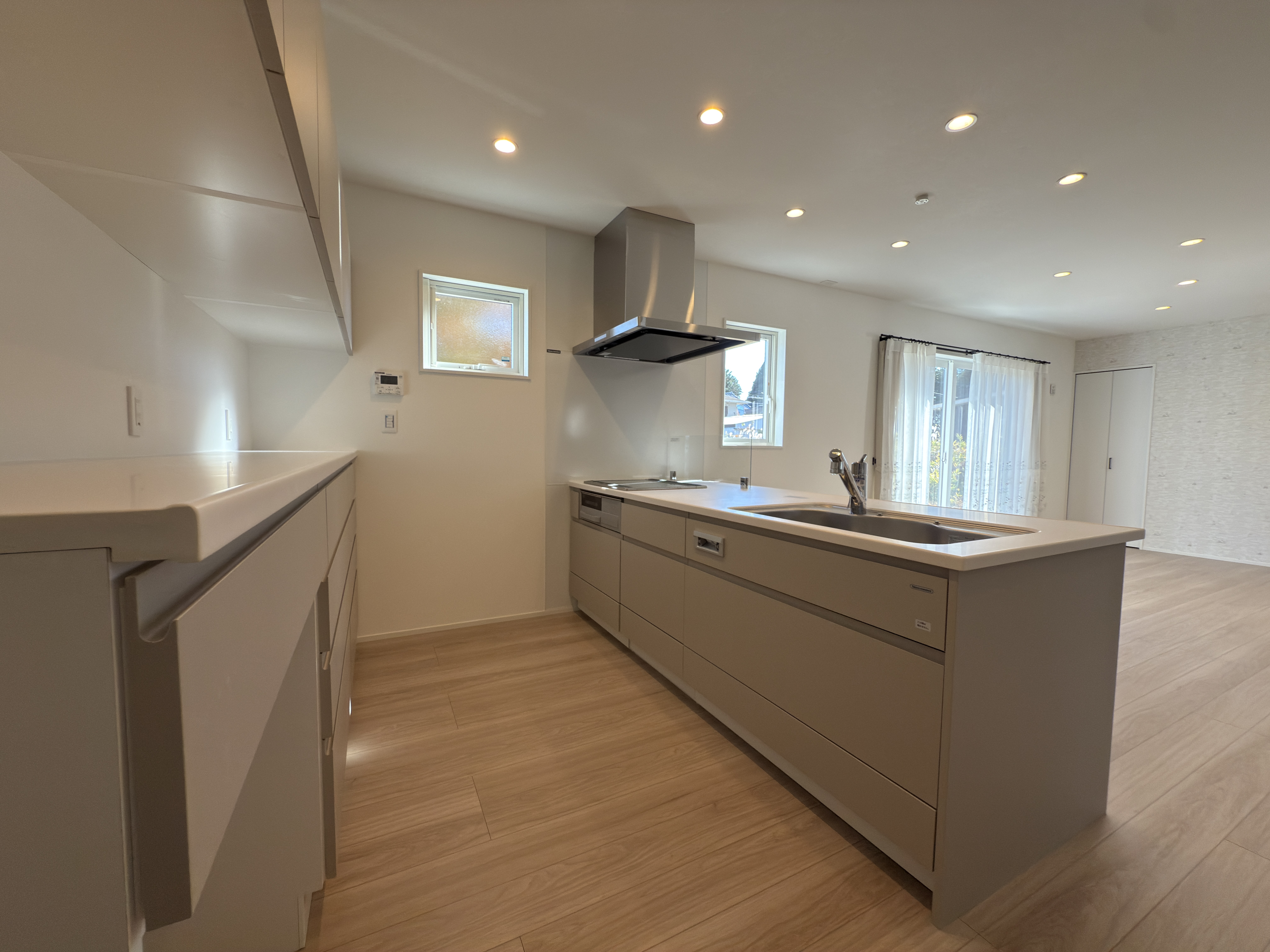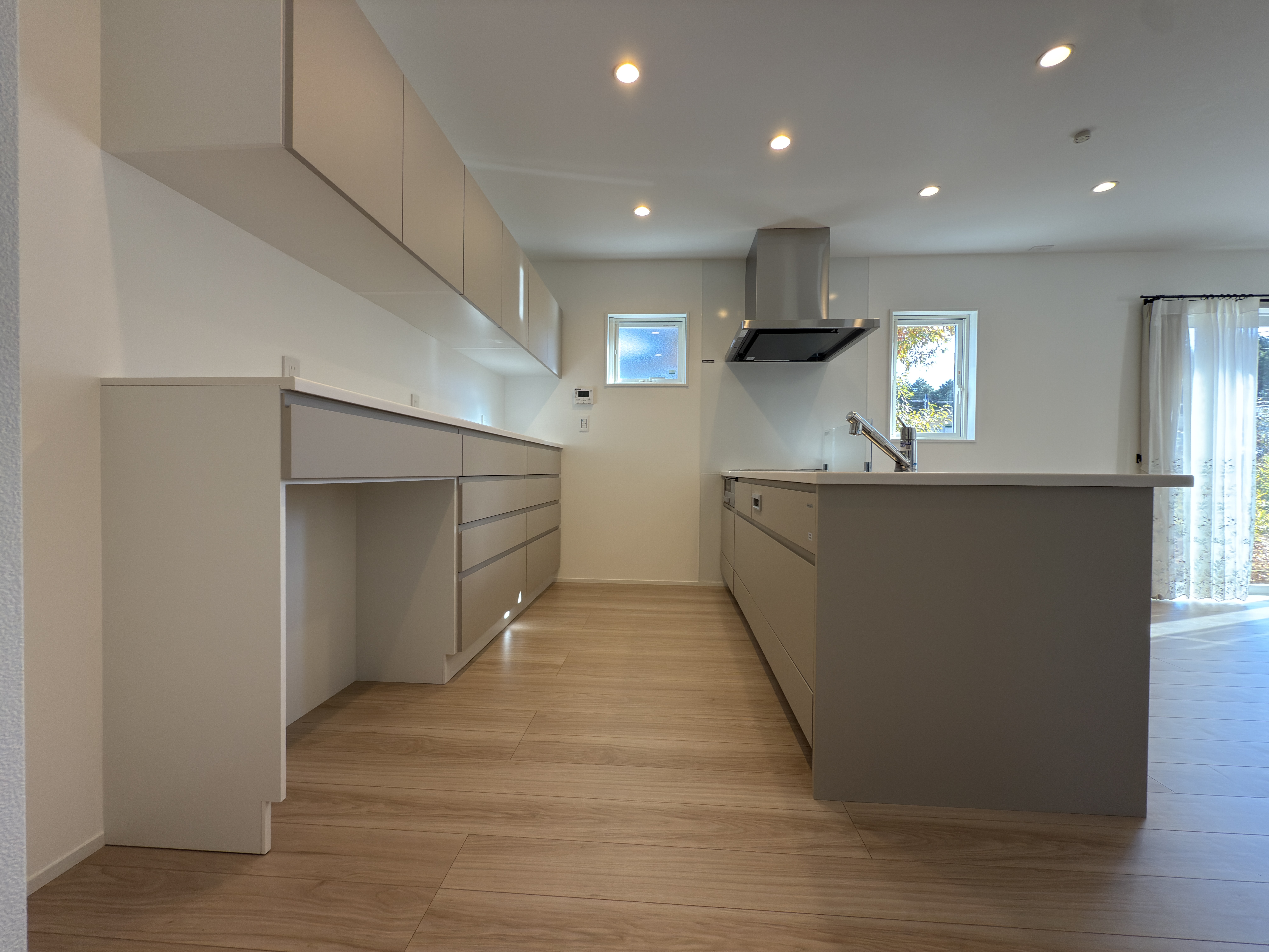 奥様が大切にこだわり、実現したペニンシュラ型キッチンはこの空間の主役となる存在。