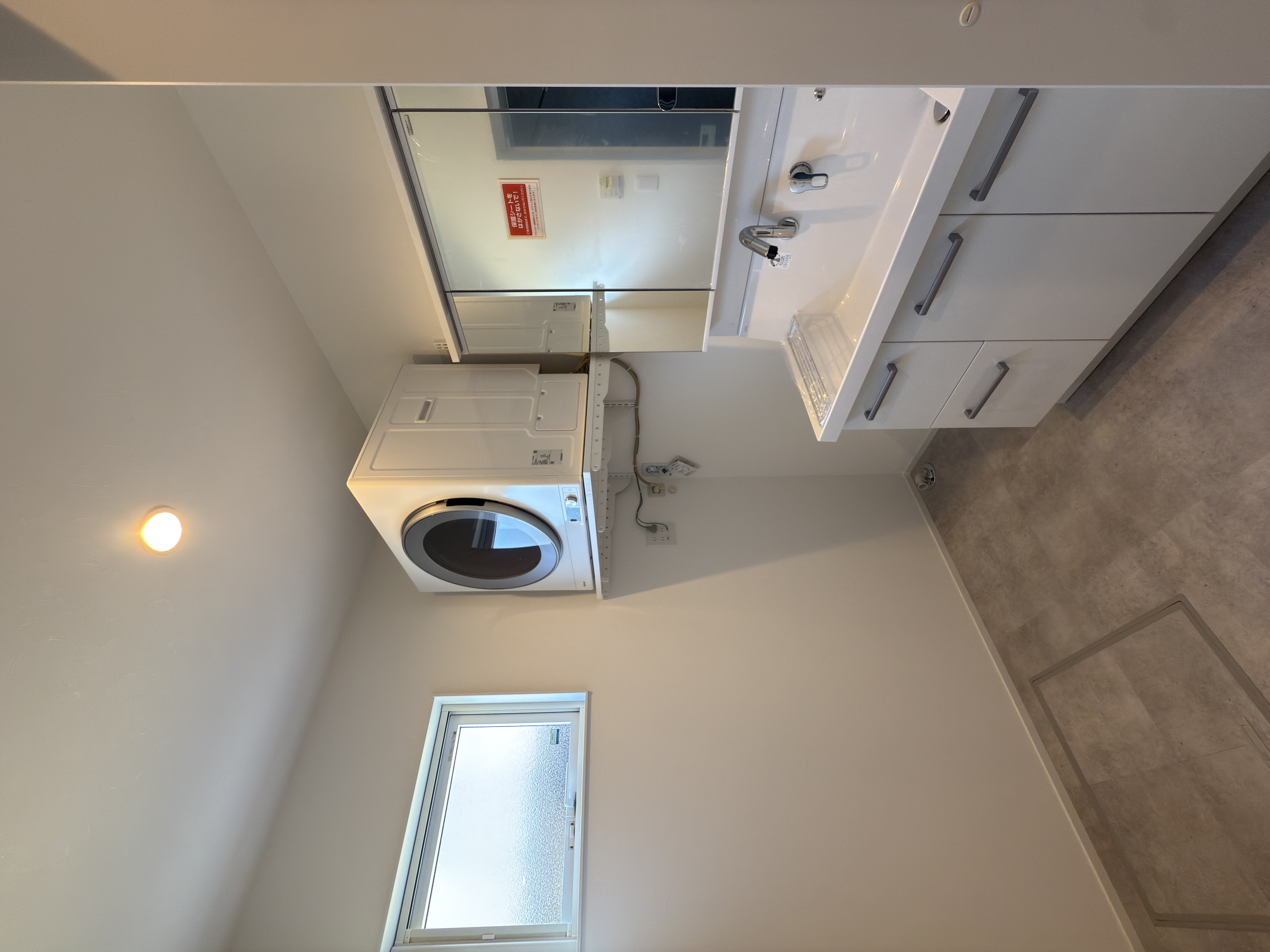 床はすべてフロアタイル仕上げ。リビングはグレーの木目でナチュラルな優しさを、キッチン・洗面・トイレはモルタル調でシャープさをプラス。